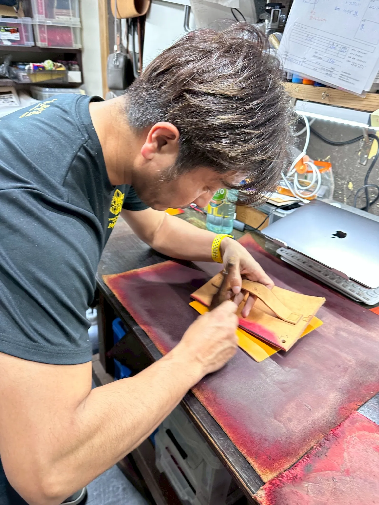 初心者の方は、革の型抜きやテープでの張り合わせ、コバ磨きなどの基礎工程から始めます。安全に取り組める簡単な作業からスタートできるので安心です。